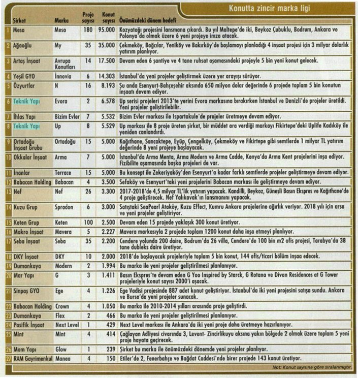 Mesa, “Mesa” markası ile Ağaoğlu “My” markası ile Teknik Yapı “Up” ve “Evora” markaları, Artaş İnşaat’ta “Avrupa Konutları” markası ile sektöre öncü oldu. Konut atılımının devam ettiği günümüzde yeni zincirler de doğuyor. Sektördeki 27 zincir marka bu güne kadar 516 projede 229 bin konut üretti.