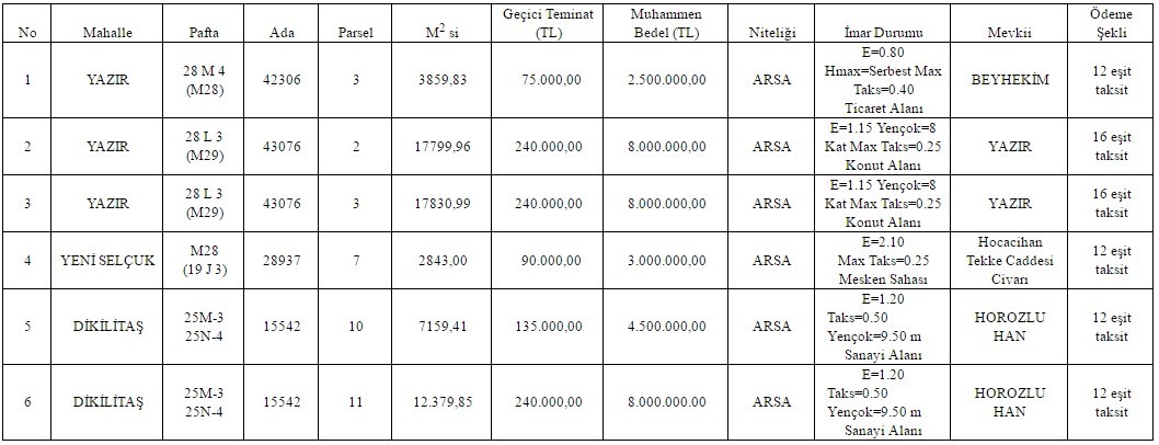 Konya Selçuklu Belediyesi, Yazır Mahallesi, Dikilitaş Mahallesi ve Yeni Selçuk Mahallesinde bulunan 6 arsayı satışa çıkardı. Altı arsanın toplam satış bedeli 34 milyon lira olarak hesaplandı.