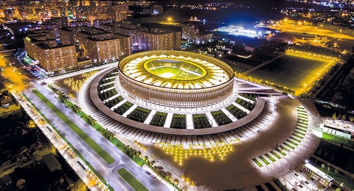 Türk inşaat şirketi ESTA Construction tarafından yapılan, dünyanın en lüks ve teknolojik stadı olarak literatüre giren Krasnodar Arena, 210 bin metre kare kullanım alanı ve 34 bin 300 kişilik bir futbol kompleksi. Seyirci sayısının 40 bin kişiye kadar çıkabildiği Krasnodar Arena’da, futbolcular stadın soyunma odalarında bir anda eksi -28 dereceye ulaşan soğuk şok ve ardından yine saniyeler içerisinde tekrar eski vücut ısılarına kavuşacakları Cryo sauna sisteminden jakuzilerine, hamamlarına ve ailelerinin maçı izleyebileceği özel restoranlı alanlara kadar her şeye sahip. Öte yandan seyirciler; maçı izlemenin yanı sıra stadın alışveriş merkezi, restoran, olimpik yüzme havuzu gibi imkanlarından da yararlanabiliyor.