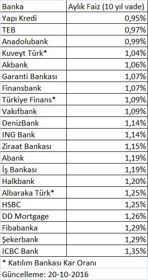 15 Temmuz’daki darbe girişiminden önce aylarca yüzde 1,17 – 1,49 bandında seyreden konut kredi faiz oranları, Cumhurbaşkanı Recep Tayyip Erdoğan’ın bankalara yaptığı çağrılar üzerine düşme eğilimine girmiş, 29 Ağustos itibariyle aylık yüzde 0,95- 1,35 aralığına gerilemişti. Konut kredi faizlerinin ilerleyen dönemde daha da düşmesi bekleniyordu ancak faizler bu kez de aylık yüzde 0,95- 1,35 aralığına demir atmış gibi görülüyor. 20 Ekim itibariyle aylık yüzde 0,95- 1,35 aralığında bulunan konut kredi faizlerinin yeni bir düşüş trendine girip girmeyeceği merak konusu…