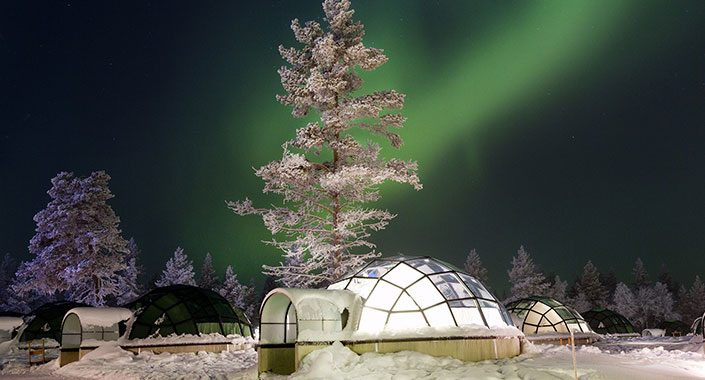 Finlandiya’nın Laponya bölgesinde yer alan Kakslauttanen, ziyaretçilerine camdan yapılmış Eskimo evlerinde, saunalı ve sıcacık bir ortamdan dışarı dahi çıkmadan kuzey ışıklarını görebilme imkanı sunuyor. Helsinki üzerinden ulaşılabilen şirin köy, Aurora Borealis’in birbirine karışan yeşil ve kırmızı tonlarına tanıklık etmek için mükemmel bir lokasyon.