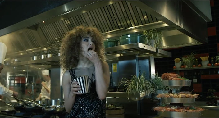 Mutfakta haute couture elbisesiyle, şeflerin arasında bir misafir görülüyor, uyumsuzluğun uyumundan doğan bir etkiyi yakalanıyor…