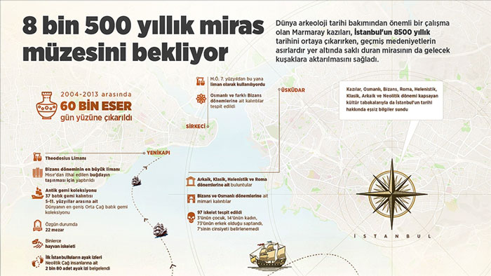 Asrın ulaşım projesi Marmaray, erken Bizans döneminin en büyük limanı olan Theodosius Limanı’nın, dünyanın en geniş antik gemi koleksiyonunun, ilk İstanbulluların ayak izlerinin, 60 bin parça eserin gün yüzüne çıkarılmasını sağladı.