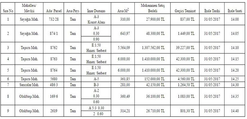 Mersin Silifke Belediye Başkanlığı, Sayağazı, Taşucu, Sarıcalar ve Olukbaşu Mahallesinde yer alan toplam 9 arsasını satışa çıkardı. Tahmini satış bedelleri 27 bin 900 lira ile 1 milyon 400 bin lira arasında değişen arsaların ihalesi 31 Mayıs Çarşamba günü saat 14.00 ‘da Silifke Belediyesi Encümen Salonunda açık artırma usulüyle yapılacaktır.