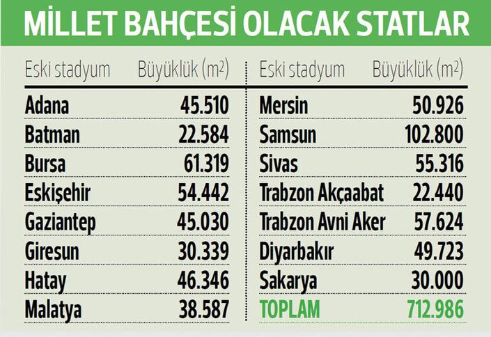 Tüm çalışmalar bitince yaklaşık 713 bin metrekare yüzölçümündeki 15 eski stadyum Millet Bahçesi olarak hayata geçecek. Yeşil alan hamlesinde ilk adım da Eskişehir’de atıldı. Mülkiyeti Başbakanlık Toplu Konut İdaresi’ne (TOKİ) ait olan 54 bin metrekarelik eski Eskişehir stat alanı Millet Bahçesi yapılmak için protokolle Türk Dünyası Vakfı’na devredildi.