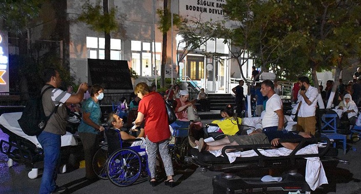 Panikle balkondan atlayan, dışarı çıkmaya çalışırken yaralanan vatandaşlar ise Bodrum Devlet Hastanesi’ne akın etti. Hastanenin bahçesi yaralılarla dolarken, acil servisin tavanındaki kaplama malzemelerinin bir bölümü çöktü. Acil servis boşaltılırken, doktorlar yaralılara bahçede müdahale etti.