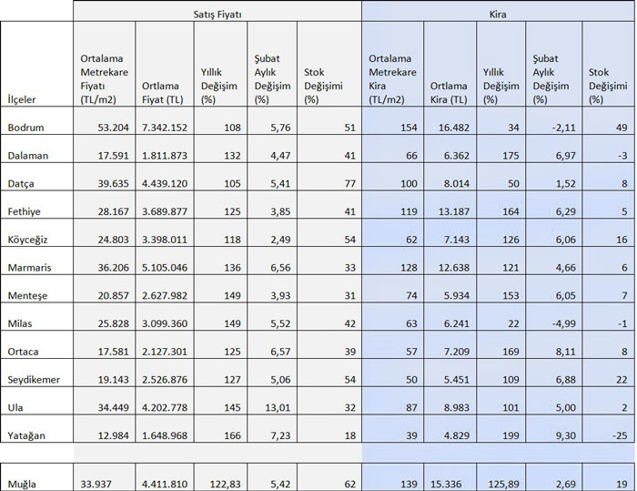 Depremin ardından göç devam ederken Muğla genelinde ortalama kira 15 bin 336 TL, ortalama satış fiyatı 4 milyon 411 bin 810 TL oldu.