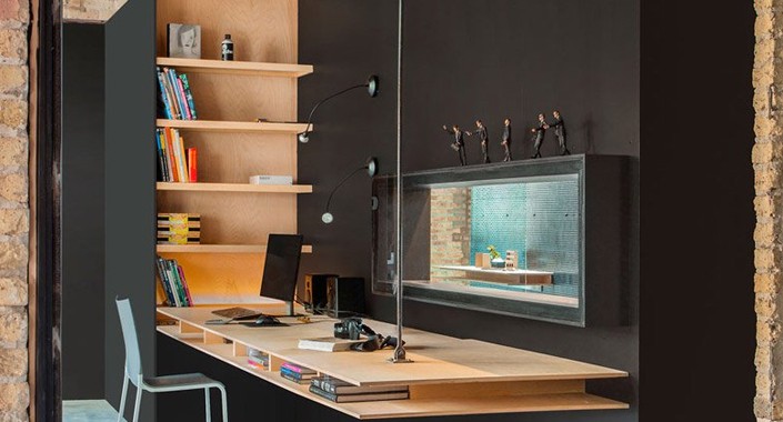 Mimarlar tarafından tasarlanmış huş ağacından kontrplak çalışma masası, duvarlara karşı olmasındansa yeni iç tasarımı öne çıkarmak için odanın merkezine yerleştirildi.