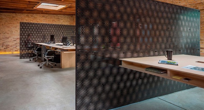 Çalışma masalarının ağırlığını desteklemek için her iki tarafa da metal levhalar döşendi. Levhalar aynı anda ayrı çalışma alanlarını gayri resmi şekilde bölerken, çift katman delikli olmaları dalgalı bir etki yarattı.
