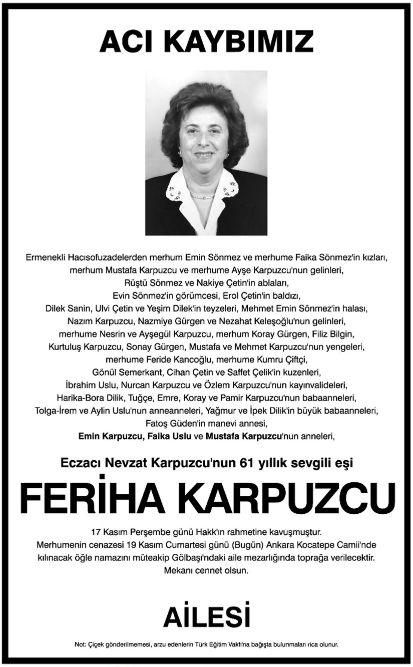 İlaç Sanayisi’nin gelişiminde önemli bir yeri olan Nevzat İlaç Sanayi’nin Onursal Başkanı Nevzat Karpuzcu‘nun eşi, Emin Karpuzcu, Mustafa Karpuzcu ve Faika Uslu‘nun anneleri, Feriha Karpuzcu 17 Kasım 2016 günü Hakk’ın rahmetine kavuştu.