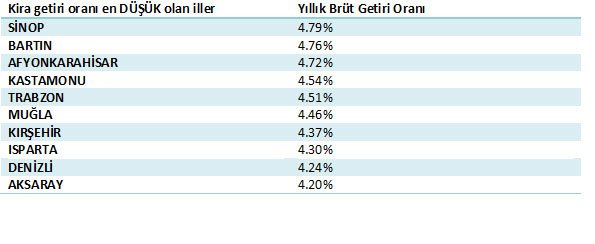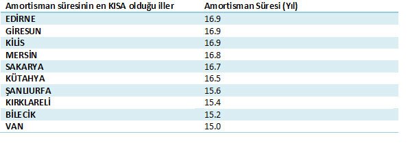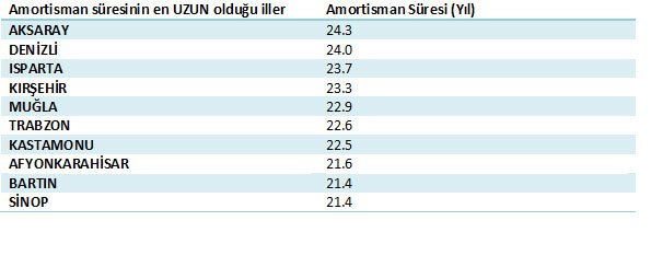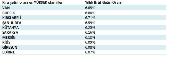 REIDIN-GYODER Yeni Konut Fiyat Endeksine göre ise İstanbul’un Asya yakasındaki projelerin fiyatları, Avrupa yakasına kıyasla 8,8 puan fazla artış gösterdi. Satın alınan evlerin kiraya verildiğinde alış fiyatını en kısa sürede edilebildiği il ise 15 yıl ile Van olarak saptandı. Amortisman süresinin en uzun olduğu şehir ise 24,3 yıl ile Aksaray oldu. En yüksek yıllık brüt kira getirisi Van’da görülürken, en düşük getiri oranının Aksaray’da olduğu tespit edildi.