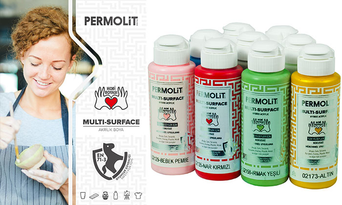 Birbirinden güzel ve canlı 54 renkten oluşan Permolit Multi – Surface hobi boyaları serimizin sağlığa zararsız olduğu uluslararası geçerliliği bulunan “CE” ile “EN 71 – 3” standartları ile onaylı. Yeni nesil hobi boyalarımız ahşap, cam, kumaş, seramik, plastik, metal, tuval, taş ve diğer tüm yüzeylerde yüksek kapatıcılık sağlamakta, kullanım sonrasında da parlaklığı yüksek olup vernik kullanımı isteğe bağlı niteliktedir. Evlerini güzelleştirerek keyifli vakit geçirmek isteyen tüketicilerimize sağlıklı ve kaliteli ürünlerimizle akılcı çözümler sunmaya devam edeceğiz.” dedi.