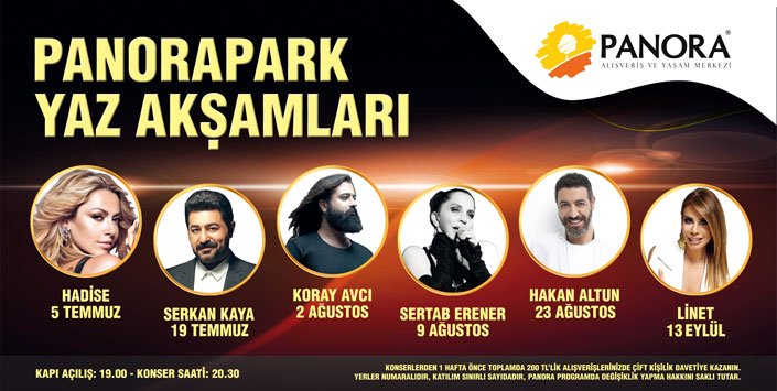 Panora AVM, 5 Temmuz’da Hadise ile başlayan PanoraPark Yaz Konserleri’ni 19 Temmuz’da Serkan Kaya, 2 Ağustos’ta Koray Avcı, 9 Ağustos’ta Sertab Erener, 23 Ağustos’ta Hakan Altun ile sürdürecek. Serinin kapanışı ise konserlerinin kapanışını ise 13 Eylül’de sahne alacak olan Linet yapacak.