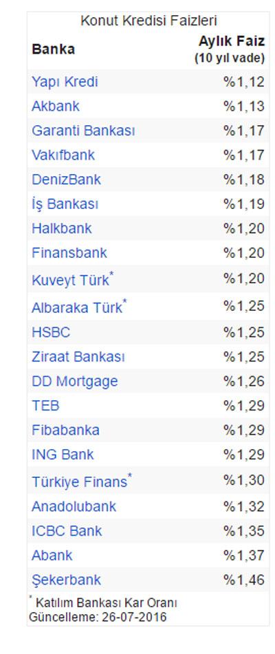 kredipazari.com’un araştırmasına göre 21 banka ve katılım bankasının uyguladığı oranlar arasında en düşüğü % 1.12 ile Yapı kredi bankası olurken en yükseği % 1.46 ile Şekerbank oldu. Katılım bankalarından sağlanan veriler en son 26 Temmuz 2016 tarihinde güncellendi.