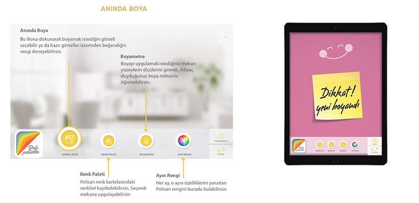 Yeni nesil mobil uygulama Polipalette’i kullanıcıların beğenisine sunan Polisan Boya, yeni uygulamasıyla binlerce renk seçeneğinin yanı sıra Ayın Rengi ya da Yıldız Ürünler seçenekleriyle kararsız kalanların imdadına yetişiyor. IOS ve Android işletim sistemleri üzerinde hem akıllı telefon hem de tablet uygulamaları bulunan Polipalette ile ellerinizi boyaya değdirmeden evinizin her köşesini hayallerinizdeki renklere boyamanız ve böylece renk seçimlerinizi kolayca yapmanız mümkün.
