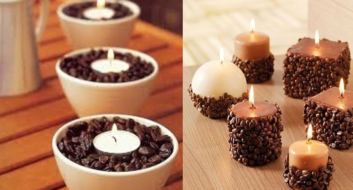 Kahve çekirdeklerini kuru yemiş kaselerine koyu ortasına minik mum yerleştirip canlandırıcı kokunun keyfini çıkarabilirsiniz. Kuru yemiş kasesine alternatif olarak daha dekoratif kahve fincanların hatta kupalara bile kullanabilirsiniz. Ya da kahve çekirdeklerini yapıştırıcı yardımıyla mumlarınıza yapıştırıp sabahları daha fresh güne başlayabilirsiniz.