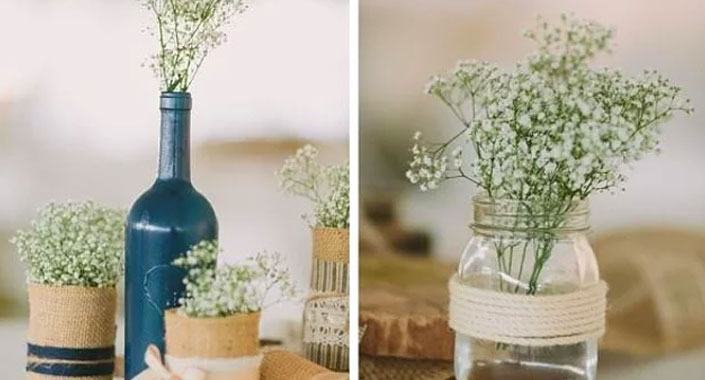 Kavanoz veya şişelerin içerisine çekilmiş kahvelerden bir miktar koyun. Üzerine taze canlı çiçekleri ekleyin.