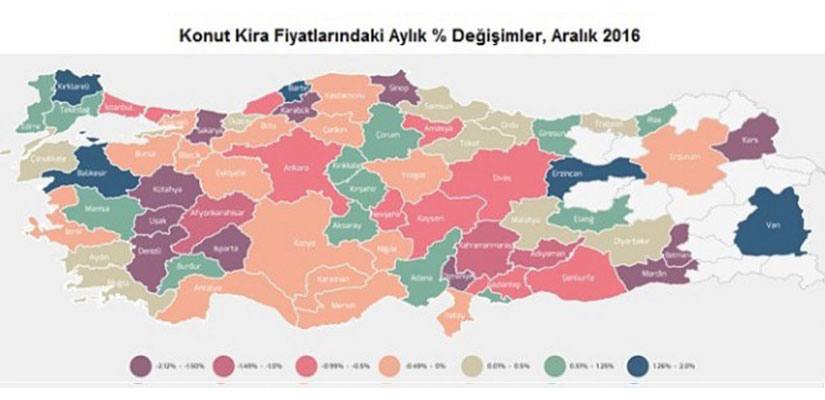 Türkiye genelinde 68 şehrin tamamını kapsayacak şekilde hazırlanan Türkiye Kiralık Konut Fiyat Endeksi’ne (TR-68) göre ise aralık ayında kira fiyatları bir önceki aya göre yüzde 0,33 oranında azalırken geçen yılın aynı dönemine göre ise yüzde 7,43 oranında arttı.