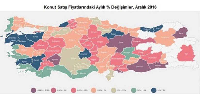 Aralıkta metrekare başına konut satış fiyatlarının yüzde 2 oranında arttığı Balıkesir fiyatların en çok yükseldiği şehir olurken konut satış fiyatlarının en çok azaldığı şehir ise yüzde 0,68 oranı ile Kars oldu.