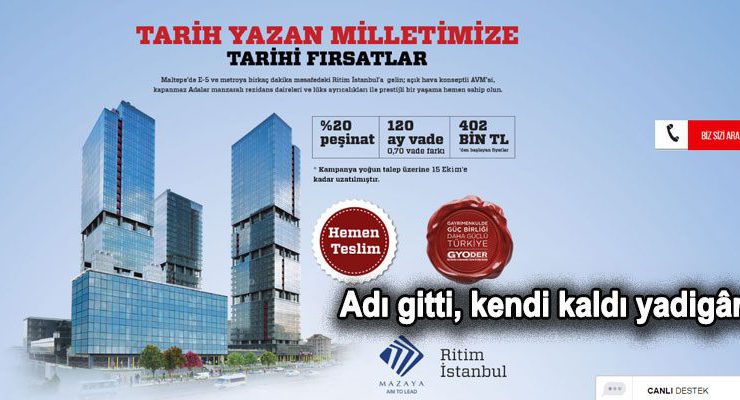 Maltepe E-5 Aksı üzerinde Dumankaya İnşaat’ın geliştirdiği Ritim İstanbul projesi görünüşe göre elden çıktı. Zira Kuveytli ortak Mazaya Holding, gazetelere verdiği ilanlarda Dumankaya’nın adını anmazken sadece kendi ismini, taksit seçeneklerini, kullanmayı tercih etti. GYODER’in 1 Ağustos’ta başlattığı tarihi indirim kampanyasında Dumankaya’nın yer aldığı projer arasında Ritim İstanbul da bulunuyordu. Anlaşılan kısa süre önce Ritim İstanbul tamamen Mazaya’ya geçti.