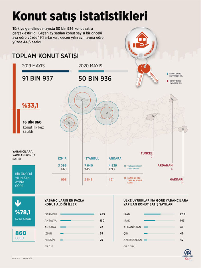 Yabancılara yapılan konut satışları mayısta geçen yılın aynı ayına göre yüzde 78,1 azalarak 860 oldu. Bu alanda ilk sırada 423 konut satışıyla İstanbul yer alırken, bu ili 130 satışla Antalya, 72 satışla Ankara, 38 satışla İzmir ve 29 satışla Mersin izledi.