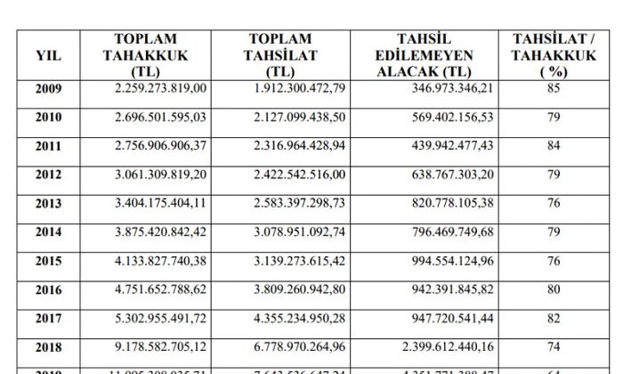 Sayıştay raporlarına göre, 2018, 2019 ve 2020 yıllarında belediyelerden tahsil edilemeyen SGK alacak miktarında ciddi artışlar dikkat çekiyor. 2020 yılında 5.962.888.297,62 TL tutarında prim alacağı tahsil edilememiş. 16.02.2021 tarihi itibari ile SGK’nın belediyelerden alacak miktarı 23.664.776.674,72 TL’ye ulaşmış durumda.