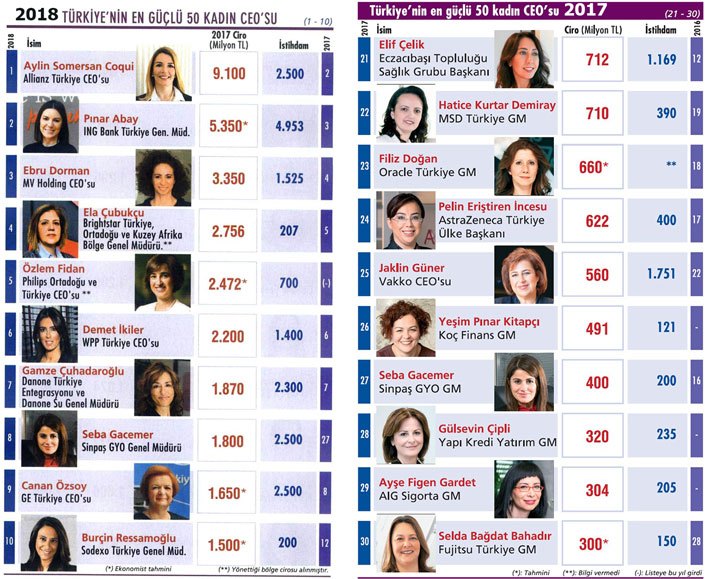 Listede bu yıl çok ciddi değişimler yaşandı. Bu yıl birinci Allianz Türkiye CEO’su Aylin Somersan Coqui oldu. Listeden görev değiştirdikleri için 11 kadın CEO çıkarken, geçen yıl CEO’luk koltuğuna oturan pek çok kadın lider ise bu yıl listeye girdi.