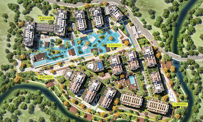 Konutlar, A1, A2, A3, A4, A5, A6, B1, B2, B3, B4, B5, C1, C2, D1, D2, D3 Blok olmak üzere toplam 16 blokta (1+1 tipinde 44 adet, 2+1 tipinde 101 adet, 3+1 tipinde 113 adet, 4+1 tipinde 55 adet, 5+1 tipinde 40, 6+1 tipinde ise 12 daire) olacak.