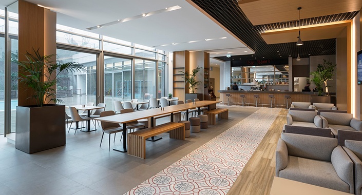 Malzeme tercihlerinde her alan için kendi özelinde kriterler oluştuğunu belirten İç Mimar Gönül Ardal malzemelerin son kullanıcıya temiz bir kullanım ve uzun ömür vadetmesi için önem gösterdiklerini belirtiyor ve ekliyor: “Sosyal tesislerde doğal taş malzemeleri zemin yerine duvar kaplamalarında tercih ediyoruz. Proje bütçelerine bağlı olarak doğal taş görünümlü kuvars, laminat, seramik gibi alternatif malzemeleri de sıklıkla değerlendiriyoruz. Malzemelerin çabuk deforme olma ihtimallerini düşünerek, son kullanıcıya temiz ve pratik bir kullanım konforu sağlayacak olmalarını da mutlaka gözetiyoruz. Rimless klozetler, tezgahla aynı akrilik malzemeden devam eden vitrifiyeler, sensörlü batarya ve rezervuar kumanda panelleri yoğun trafikli alanlarda tercih ettiğimiz ıslak hacim ürünlerinden. Duvar kağıdı kullandığımız alanlarda ise genellikle tekstil tabanlı, vinil yüzeyli ürünleri tercih ediyoruz. Fitness alanlarında ise kardiyo veya ağırlık çalışma alanlarına uygun olacak kalınlık ve dayanıklılıkta PVC kaplamalar kullanıyoruz. Özellikle sosyal tesislerde enerji ve su tasarruflu ürünler ile sürdürülebilir malzemelerin kullanımına dikkat ediyoruz.”
