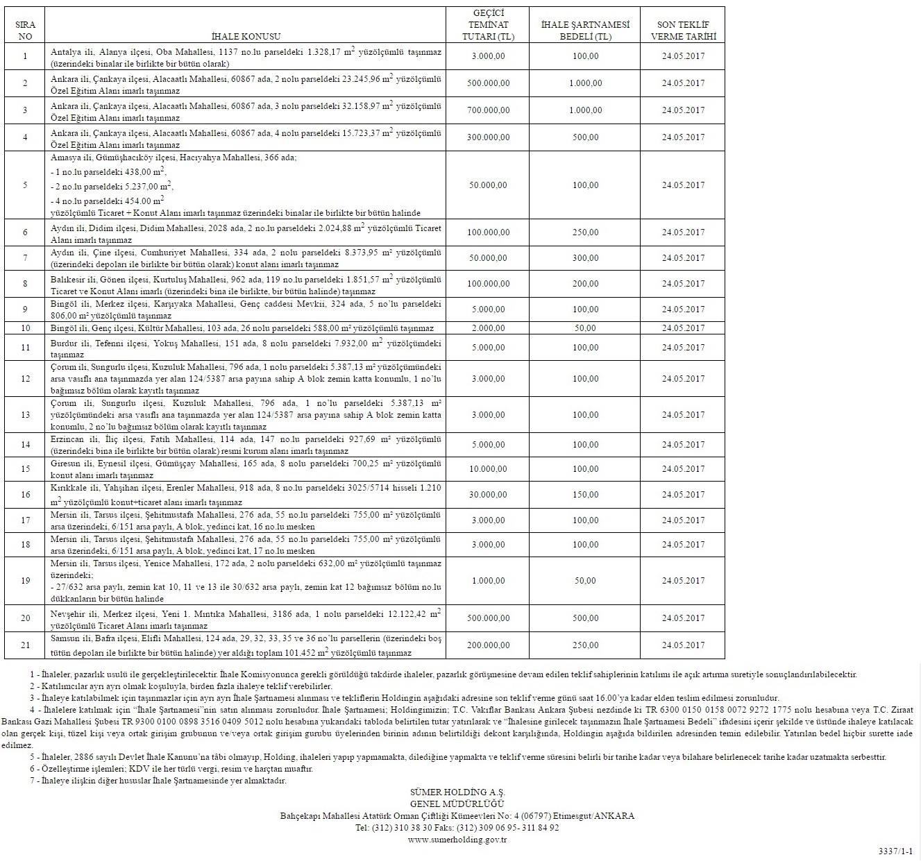 Sümer Holding AŞ. Genel Müdürlüğü, mülkiyetinde bulunan taşınmazları satış yöntemi ile özelleştiriliyor. Ankara, Amasya, Aydın, Balıkesir, Bingöl, Burdur, Çorum, Erzincan, Giresun, Kırıkkale, Mersin, Nevşehir ve Samsun’da yer alan 21 arsa ve konut nitelikli taşınmazın ihalesi 24 Mayıs 2017’de pazarlık usulü ile gerçekleştirilecektir.