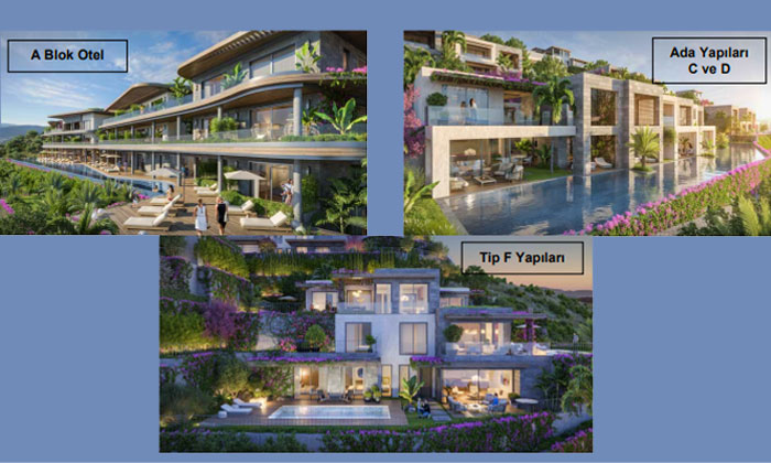 Proje bünyesinde; 1 adet Ana Otel Bloğu, 9 adet F blok ve 4 adet Ada Bloğu yer alacak. A Blok otel binası kapsamında; 4 oda tipinde standart oda ve 2 dublex oda (suit) tiplerinde olmak üzere toplam 24 oda bulunacak. Ada Yapıları ile F Tip Yapılarda 49 ünite kapsamında toplam 123 oda bulunacak. Ayrıca projede Ada Yapıları (C-D) ve Tip F Yapıları olmak üzere 2 tipte konaklama daha mevcut olacak. Tip F Yapılarında 81 oda ve Ada Yapılarında ise 42 oda bulunacak. Bu yapılar da suit ve apart şeklinde inşa edilecek olup toplam 123 oda kapasiteli olacak.