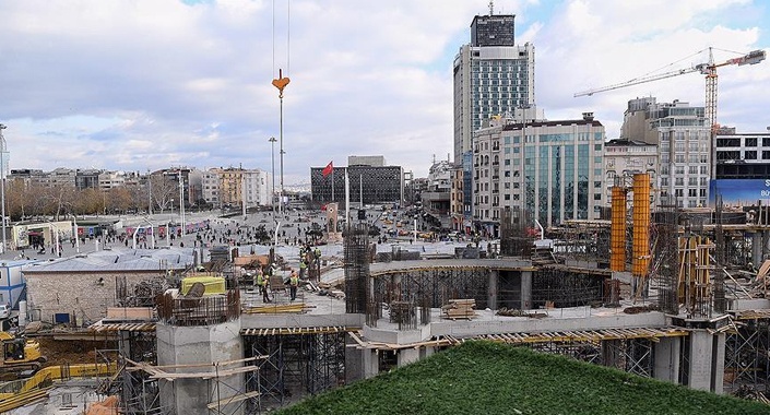 Taksim’de yapımı süren caminin ana iskeleti yükselirken, kültür ve sanat merkezi olarak kullanılacak alt kat ile otopark olarak kullanılacak bölümde çalışmalar sürüyor.
