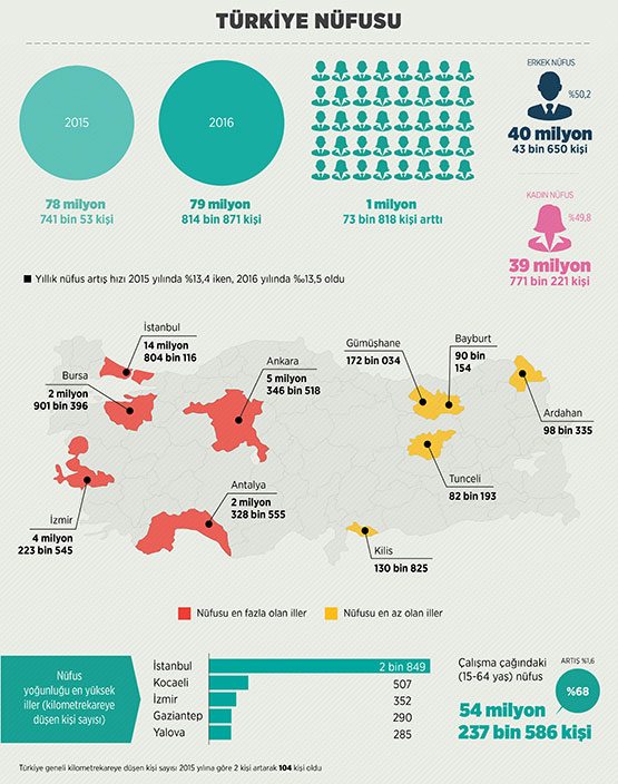 Türkiye İstatistik Kurumu’nun (TÜİK) açıkladığı ‘Adrese Dayalı Nüfus Kayıt Sistemi 2016 Sonuçları‘na göre, Türkiye nüfusu 2016’nın sonunda 1 milyon 73 bin 818 kişilik artışla 79 milyon 814 bin 871 kişiye ulaştı. AA’nın haberine göre, Türkiye nüfusu 2015 yılı itibarıyla 78 milyon 741 bin 53 kişi olarak açıklanmıştı. 40 milyon 43 bin 650 kişi olan erkek nüfusun oranı yüzde 50,2, 39 milyon 771 bin 221 kişi olan kadın nüfusun oranı ise yüzde 49,8 olarak hesaplanırken yıllık nüfus artış hızının, 2015’te binde 13,4 iken, 2016’da binde 13,5’e yükseldiği açıklandı.