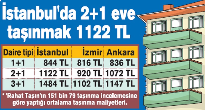 İstanbul’da 1+1 eve taşınmanın ortalama maliyeti 844 lirayı buldu. Ankara’da 836 lira, İzmir’de ise 816 lira oldu. 2+1 eve taşınmanın maliyeti İstanbul’da ortalama 1122 lira, Ankara’da 1072 lira ve İzmir’de 920 lira. İstanbul’da 3+1 ev taşıma maliyeti 1484 lira, Ankara’da 1147 lira ve İzmir’de 1102 liraya çıktı. İstanbullu’nun yüzde 40’ı 2+1, yüzde 30’u 3+1, yüzde 20’si 1+1 eve taşındı.