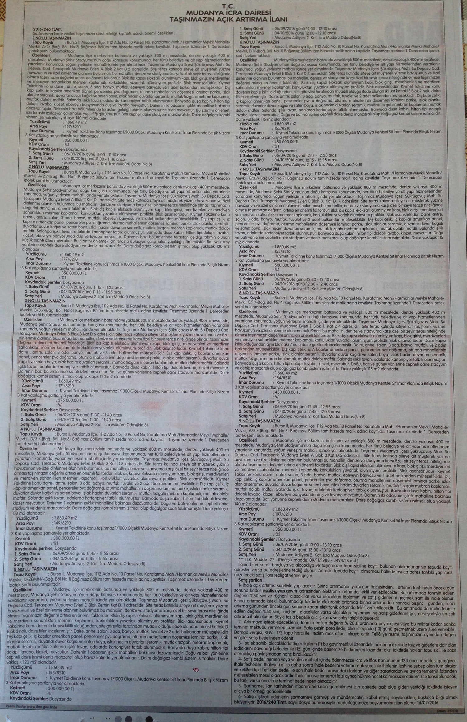 Teraspark Mudanya Evleri’nin icradan satışları 6 Eylül 2016 tarihinde saat 11.00’de başlayarak 13.10’a kadar Mudanya Adliyesi’nde gerçekleştirilecek. Evlere alıcı çıkmadığı takdirde 4 Ekim 2016 tarihinde aynı yer ve saatte tekrar satışa sunulacak.
