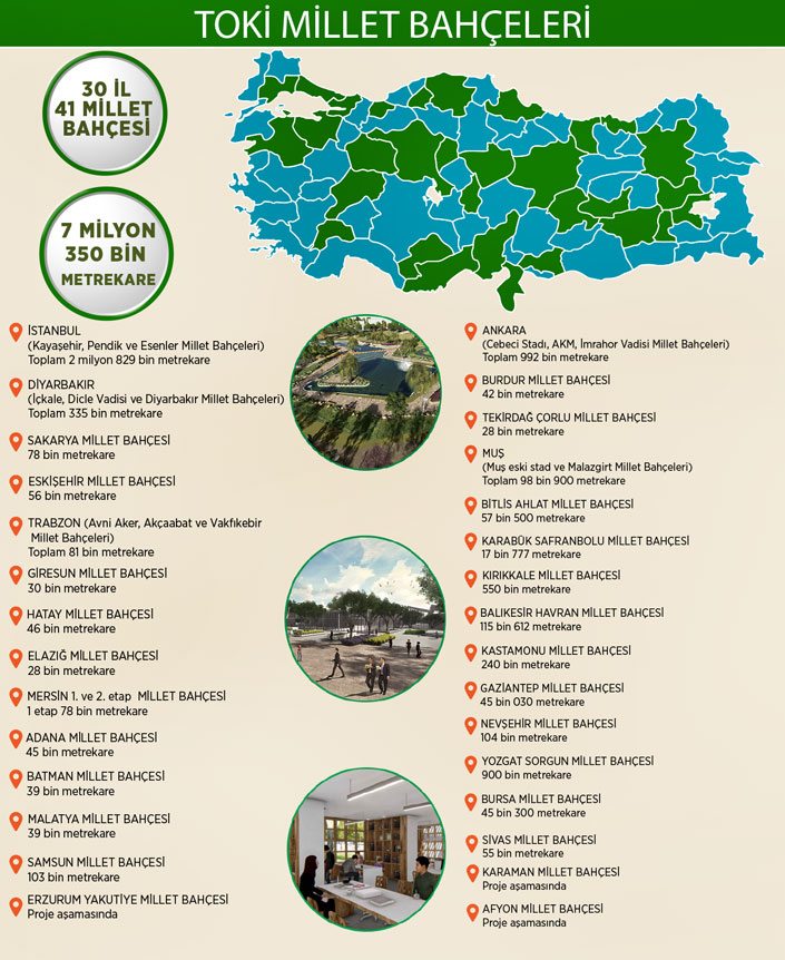 Şubat ayında ise Sakarya, İstanbul Kayaşehir 2.3. ve 4. etaplar, Samsun, Ankara İmrahor Vadisi 1. Etap, Bursa, Eskişehir, Mersin ve Sivas olmak üzere 8 millet bahçesinin ihalesini gerçekleştireceğiz.” dedi.