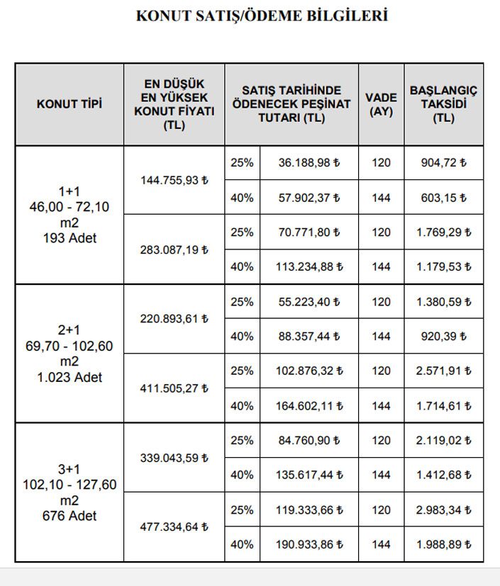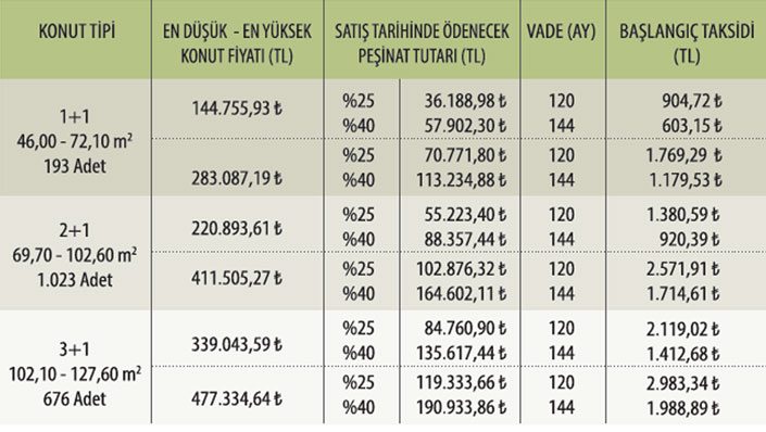 Satılacak konutların satış işlemleri yüzde 25 peşinat bedeli 120 ay vade ve yüzde 40 peşinat bedeli ile 144 ay vade seçenekleri ile gerçekleştirilecek. Satılacak konutların satış bedelleri 144 bin 755 TL’den başlıyor. En düşük konut taksiti ise aylık 603 TL olarak hesaplandı.