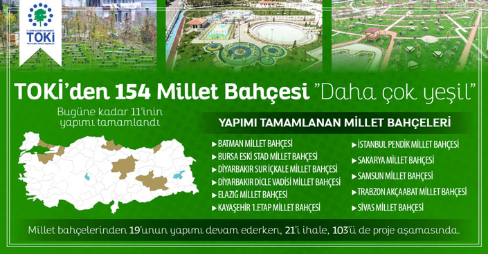 Çevre ve Şehircilik Bakanlığı Toplu Konut İdaresi (TOKİ) Başkanlığınca 81 ilde 154 millet bahçesi yapılacak. TOKi tarafından yapımı tamamlanan 11 millet bahçesinin arasında Sakarya Millet Bahçesi, Batman Millet Bahçesi, Bursa Eski Stat Millet Bahçesi ve İstanbul Pendik Millet Bahçesi de yer alıyor.