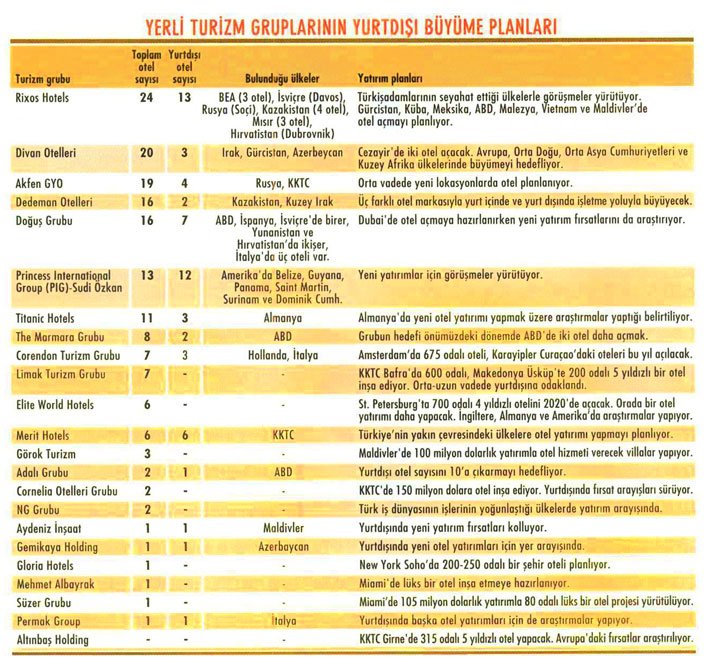 Dünyanın önemli turizm ülkelerinden biri olan Türkiye’de Divan Grubu’ndan Rixos’a, Dedeman’dan Doğuş Grubu’na kadar yerli zincirler, yurt içindeki büyümelerini farklı coğrafyalara taşımaya başladılar. Bu süreçte kimi mülk yatırımı yoluyla kimi de işletme yoluyla ABD’den Maldivler’e, Rusya’dan İtalya’ya kadar dünyanın farklı ülkelerine otel yatırımı yapıyorlar.