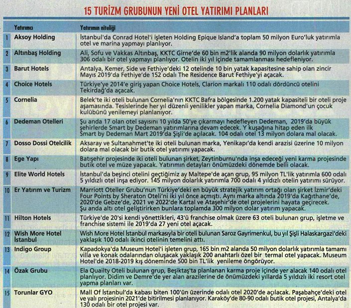 13-İndigo Group Kapadokya’da Museum Hotel’i işleten grup, 165 bin m2 alanda 50 milyon dolarlık yatırımla tamamı villa ve konak odalarından oluşacak yaklaşık 200 anahtarlı özel bir termal otel yapacak. Museum Hotel’de 2018-2019 kış döneminde 500 bin TL’lik yenileme öngörüyor.