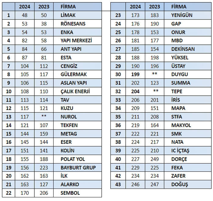Geçen yıl olduğu gibi ilk 100 firma arasına 6 Türk firması girmeyi başardı. Bir Türk firması da ilk 50 arasında yer buldu.