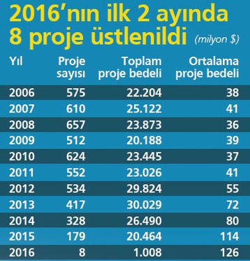 Ekonomi Bakanlığı’nın raporuna göre, 2015’te üstlenilen toplam proje bedeli ise 26,4 milyar dolardan 20,4 milyar dolara gerilerken proje sayısındaki düşüşün toplam bedelden yüksek olması, küçük müteahhitlerin aldığı işlerin sayısındaki azalmaya bağlandı. Özellikle komşu ülkelerde küçük işlere imza atan Türk müteahhitlerin, 2015’te aynı performansı gösteremediği belirtilen raporda 2016’ya ilişkin ilk verilerin de umut vermediği belirtildi. Buna göre, ilk 2 ayda Türk müteahhitlerin aldığı iş sayısı 8’de, toplam bedel ise 1 milyar dolarda kaldı.