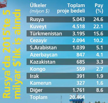 Projelerin neredeyse 4’te 1’inin Risya’da olduğu görüldü. Rusya’nın yurtdışı projelerdeki payı yüzde 24,6 olurken BDT ülkelerinin payı yüzde 49, 9 olarak hesaplandı. Bu iki bölgeyi 6.1 milyar dolarla Ortadoğu, 3.4 milyar dolarla Afrika ve 626 milyon dolarla Avrupa izledi. Türk müteahhitler 2015’te yüzde 27.5’lik payla en çok havalimanı projesi üstlendi. Havalimanlarını sırasıyla, enerji santralları, petrokimya tesisleri, konut projeleri ve fabrikalar takip etti.