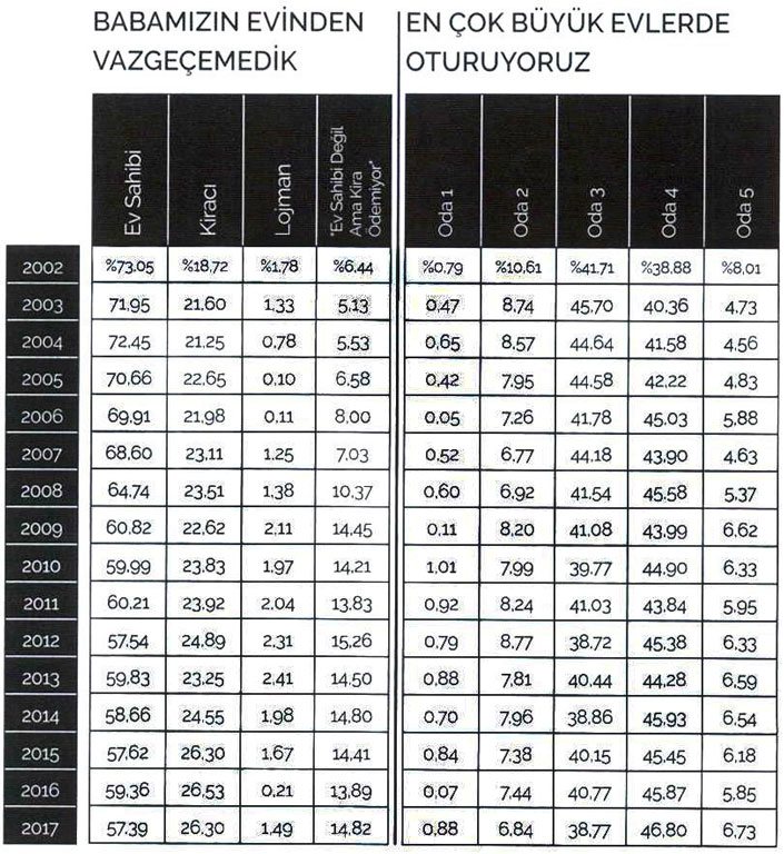 Nitekim, raporda Türkiye’de ev satın alan kitlenin yüzde 65’lik bölümünün hâlihazırda ev sahibi olduğuna, ikinci ve üçüncü evini aldığına dikkat çekilmişti. 3,5 milyon kişinin babasının evinde yaşadığını ortaya koyan TÜİK verileri aynı zamanda ülkemizde ev alma hayali kuran asıl kitlenin kiraya mahkum kaldığını da ortaya koyuyor.