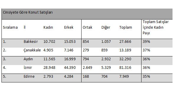 Yaklaşık 27 bin 600 adet konutun, 10 bin 700 adedi kadınlar tarafından satın alınan Balıkesir, yüzde 39’la listede ilk sırada yer alırken toplam satışlar içinde kadın payının en fazla olduğu diğer iller, sırasıyla; yüzde 37 ile Çanakkale, yüzde 36 ile Aydın ve İzmir, yüzde 35 ile Edirne olarak sıralanıyor. 2015 yılı ile karşılaştırıldığında İlk 5 sıralamasının aynı olduğu saptanan araştırmada yeni düzenlemeler ve özel sektör kampanyaları ile birlikte konut satışlarına paralel olarak kadın payının da artacağı tahmini belirtiliyor.