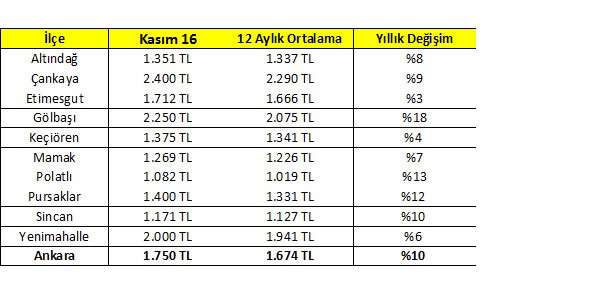 Satılık konut fiyatlarının son bir yılda yüzde 10 oranında artarak 1750 TL metrekare ortalamasına ulaştığı Ankara’da kiralık konut fiyatları da yüzde 10 artarak metrekarede 9 TL mertebesine geldi.. 16 yıl amortisman süresi olan Ankara’da son bir ayda satılık konut fiyatlarının en fazla arttığı ilçeler yüzde 5,4 ile Gölbaşı, yüzde 3,8 ile Polatlı, yüzde 1,6 ile Etimesgut olarak sıralandı.