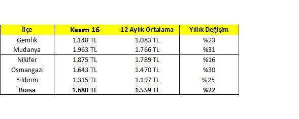 Bursa’da satılık konut fiyatları Kasım 2016 itibariyle, yıllık yüzde 22 artışla 1680 TL olurken, kiralık fiyatları yüzde 18 artışla metrekare bazıda 8 TL’ye ulaştı. Amortisman süresinin 18 yıl olarak hesaplandığı Bursa’da, geçen bir aylık süreçte fiyatların en çok arttığı ilçeler yüzde 3,8 ile Gemlik, yüzde 3,5 artışla Mudanya, yüzde 2,5 artışla Osmangazi oldu.
