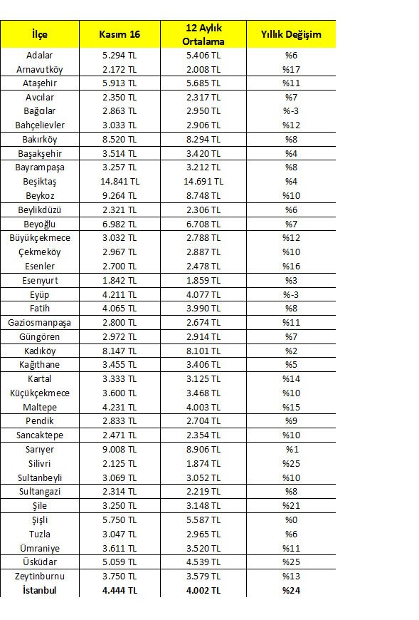 Hürriyet Emlak’ın İstanbul, Ankara, İzmir, Bursa ve Antalya olmak üzere 5 ilin ortalama değerlerini alarak oluşturduğu emlak endeksinin kasım ayı sonuçlarına göre, Türkiye’de satılık konutların ortalama metrekare fiyatı son bir yılda yüzde 16 oranında artarak 2 bin 799 TL’ye ulaştı.