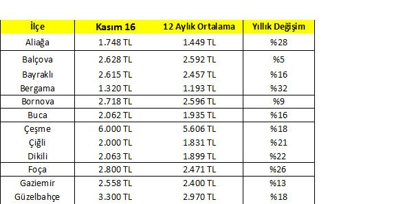 İzmir’de satılık konutların metrekare ortalama fiyatı son bir yılda yüzde 15 oranında artışla 2 bin 414 TL olurken kiralık konutlarda ise fiyatlar yüzde 13 oranında artarak metrekare bazında 11 TL ortalamasına ulaştı. İlde Amortisman süresi 19 yıl olarak hesaplandı. İzmir’de, fiyatların en fazla arttığı ilçeler yüzde 12,5 ile Karaburun, yüzde 7,2 artışla Bergama, yüzde 5,2 ile Tire oldu.