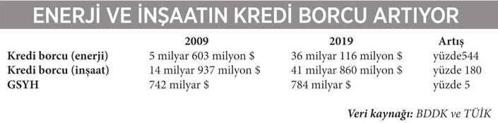 Bankacılık Düzenleme ve Denetleme Kurumu’nun verilerine göre 2009 haziranından 2019 haziranına kadar geçen 10 yıl içinde inşaat sektörünün borcu 14,9 milyar dolardan 41,8 milyar dolara yükselerek tam yüzde 180 artmış oldu. Üstelik enerji sektöründe durum bundan daha beter.